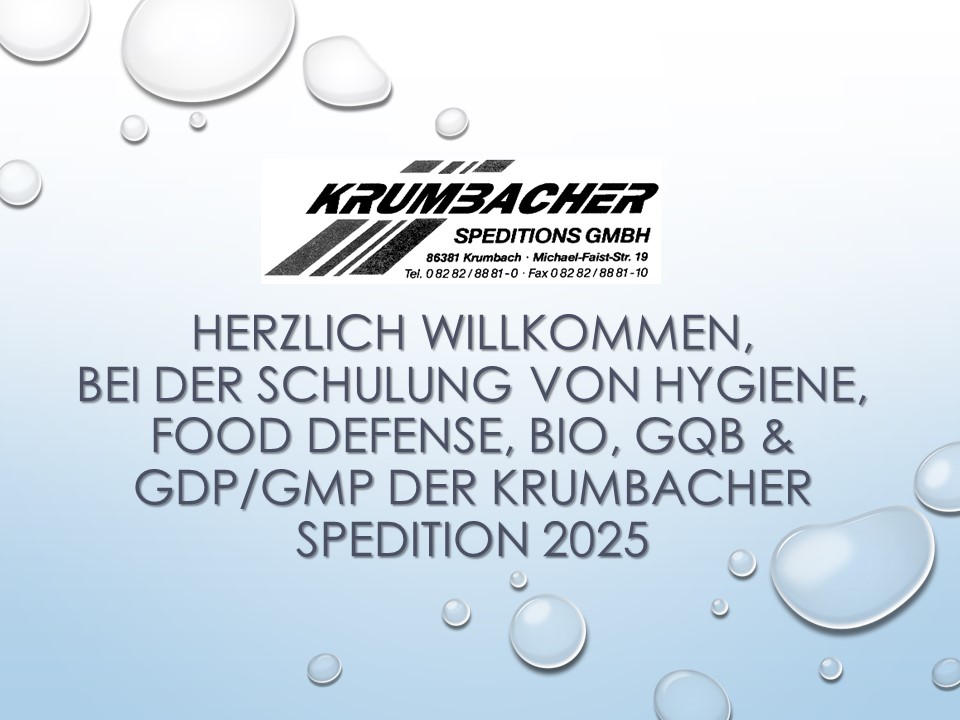 Herzlich Willkommen, bei der Schulung von Hygiene,  Food Defense, BIO, GQB & GDP/GMP der Krumbacher Spedition 2025